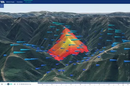Por otra parte, cuenta con un simulador de expansión de incendios: este permite seleccionar un punto cualquiera en el mapa o introducir unas coordenadas. Una vez seleccionado el lugar, posibilita escoger la duración total de la simulación y la hora a la que ha comenzado el incendio. Además, se pueden introducir variables como cambios orográficos, la realización de cortafuegos o variaciones en el combustible, lo que permite conocer su intensidad, la velocidad de expansión o la altura de las llamas.